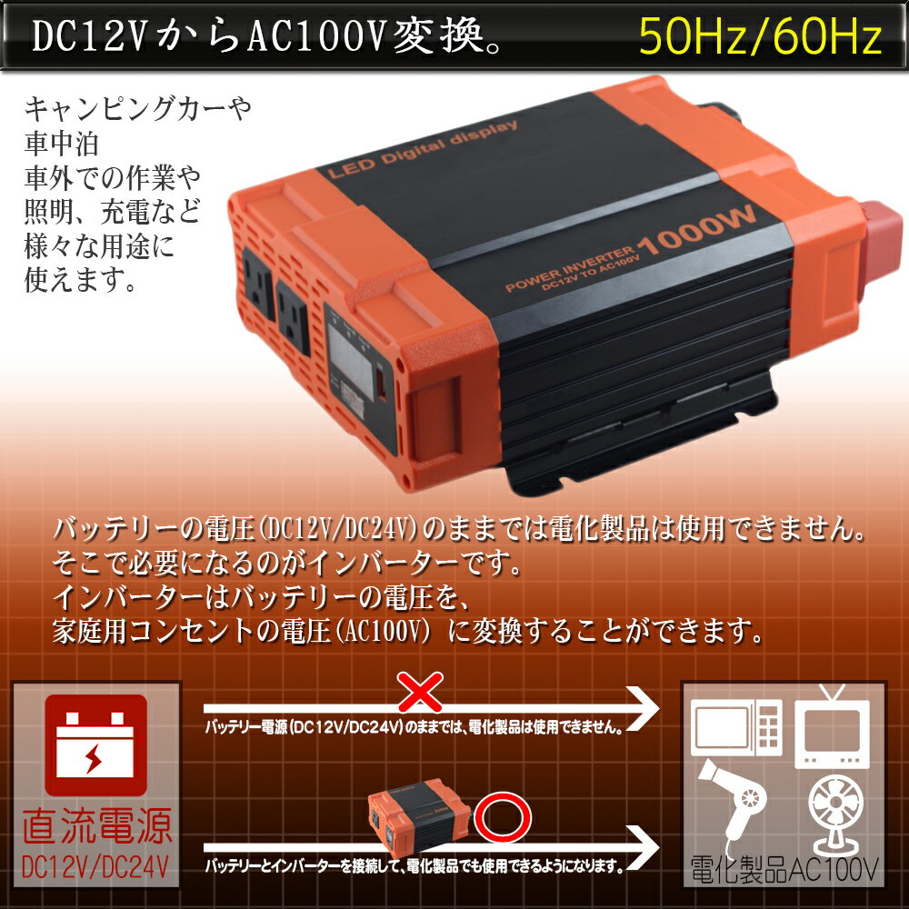商品説明 【商品仕様】 12V定格 1000W 瞬間2000W 50/60Hz共通 高出力インバーター ○入力電圧:DC12V ○出力電圧:AC100V ○定格出力:1000W ○最大出力:2000W ○出力周波数:50Hz/60Hz切替 ○出力仕様:ACコンセント(2口) ○出力波形:矩形波(擬似正弦波) ○USB出力:DC5V/1.0A ○使用温度環境:-10℃〜40℃ ○本体素材:アルミ ○本体サイズ(約):260×82×186mm ○重量(約):2000g 【商品機能】 ○回路保護 ○入力低電圧警報音 ○低電圧遮断 ○過温度遮断 ○過負荷遮断 ○短絡遮断 ○入力過電圧保護 ○入力逆接続保護機能 商品内容 本体 × 1 バッテリー接続コード 赤 × 1本 黒 × 1本 日本語説明書 × 1 ※USBケーブルは付属しておりません。