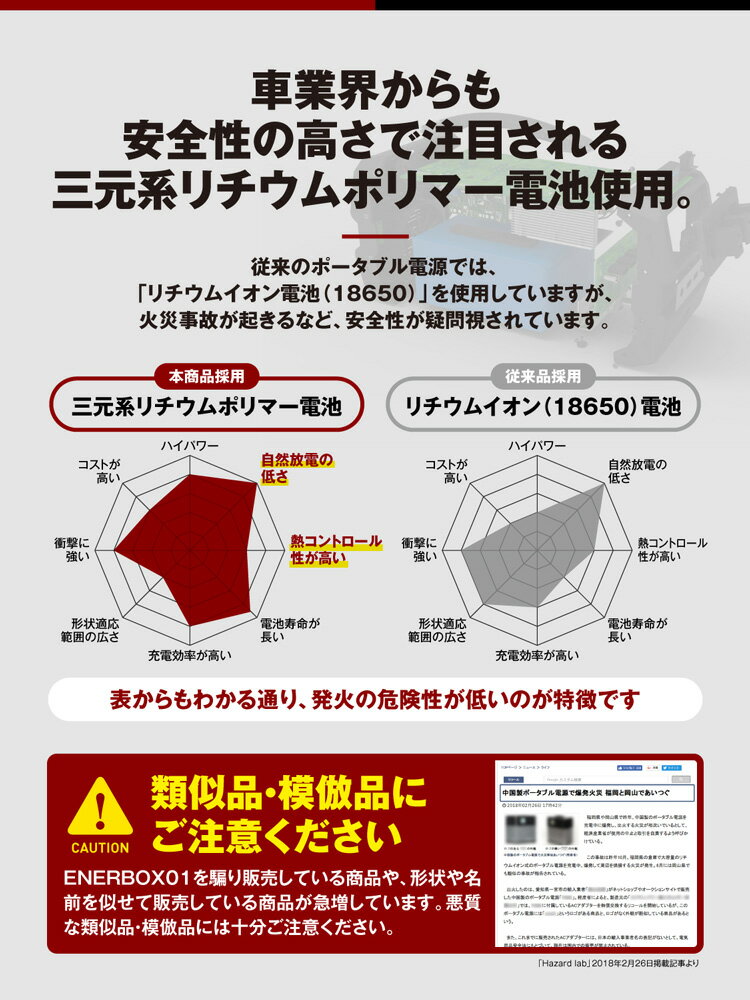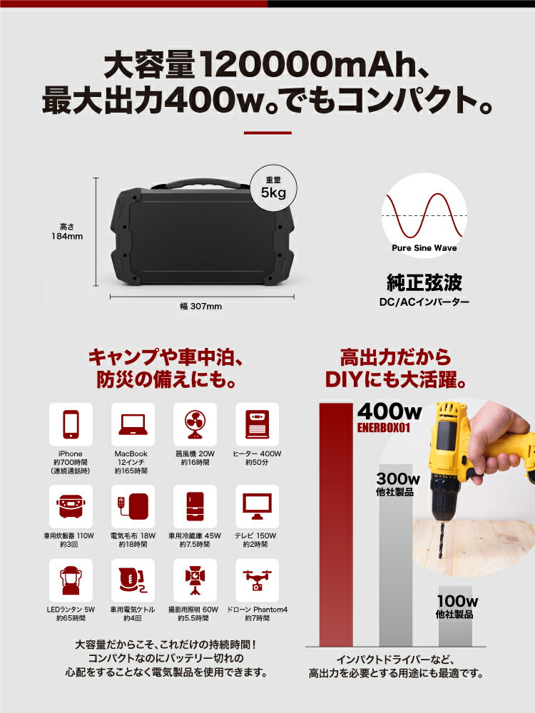 商品名:ポータブル電源 ENERBOX 型番:CITAEB-01 バッテリー容量:444Wh( 120000mAh ) バッテリー種類:三元系リチウムポリマー電池 充電方式:CC-CV方式 入力:DC12.5V~24V / 6.2A AC出力:100V-60Hz / 400W 正弦波 USB出力: 5V / 2.1A(×3ポート) DC出力:9~12.6V / 15A シガーソケット出力:9~12.6V / 15A 重さ:5kg 本体充電所要時間:約6時間(ACアダプター使用時) 付属品:本体、ACアダプター、カーチャージャー、説明書 使用用途:最大消費電力400W以下の電化製品への給電 出力波形:純正弦波 対応ソーラーチャージャー:DC18V-6A(最大)、推薦80W~100W、入力DCコネクタ規格:5.5*2.1*9.5(or 11)mm 使用シーン:アウトドア、車中泊、ドローン撮影、ラジコン、夜釣り、DIY、工務店(現場)、カメラマン撮影、車・バイク・ボートバッテリー充電など 【注意事項】 本体故障の原因となりますので、以下の内容にご注意してお使いください。